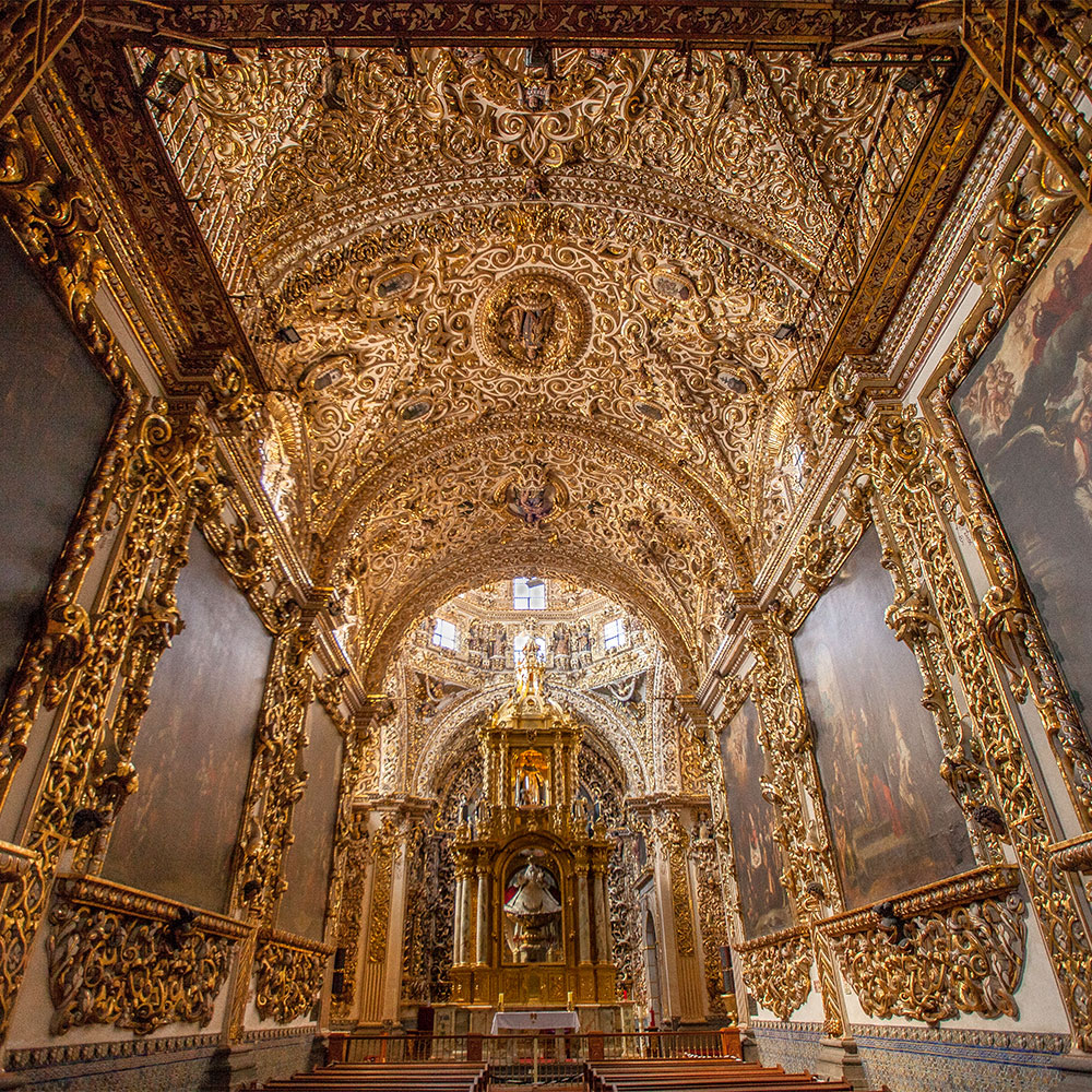 Dentro del Templo de Santo Domingo en el centro de Puebla, se encuentra esta joya arquitectónica del barroco novohispano en México del siglo XVII: La Capilla del Rosario. No obstante, también es conocida como el ‘Relicario de América’, nombrada así por el papa Juan Pablo II en su primera visita al país en 1979. La verdad es que esta construcción te dejará con la boca abierta, gracias a su revestimiento de estuco dorado, lámina de oro, ónix y azulejos de talavera poblana.